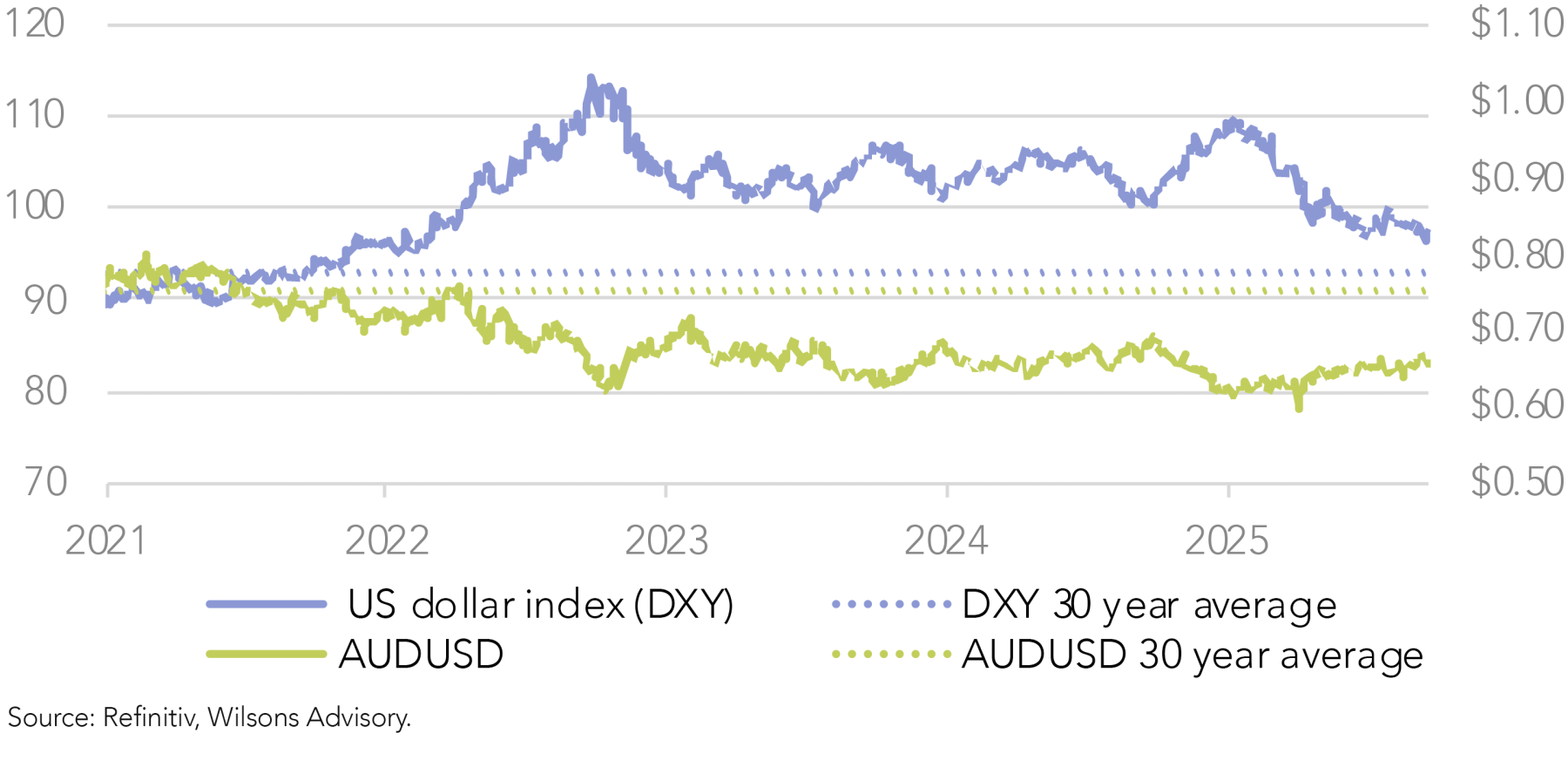 Since its January peak, the US Dollar Index (DXY) has fallen by around 12%. Despite a brief interruption from April’s risk-off episode, where the US dollar bounced higher, its underlying momentum has been weak through the year. The Australian dollar has been a beneficiary of this dynamic, rising approximately 7% since January.