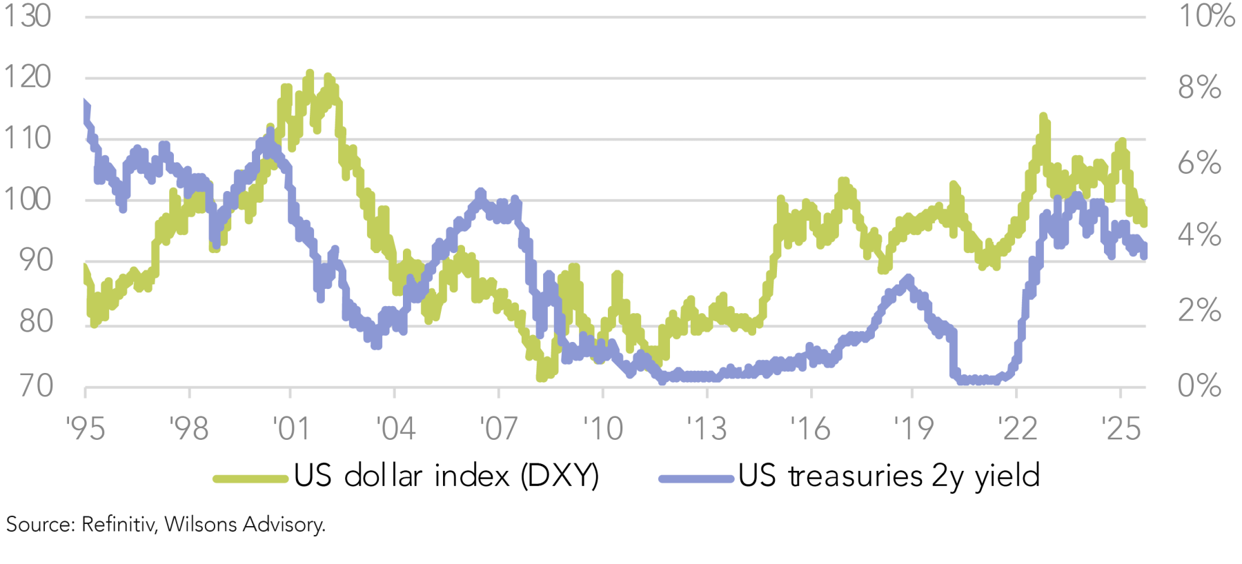 The weakness in the DXY has been broad-based, with the euro gaining 14% against the greenback, and the pound rising 8% since January. While the Australian dollar performance has lagged key majors such as the euro, pound, and yen since January (down -6%, -1%, and flat respectively), its relative strength has improved more recently, with the Australian Trade Weighted Currency (TWI) basket rising 2% from April. Against the US dollar specifically, the Australian dollar has appreciated 11% since its April lows, reflecting both cyclical tailwinds and structural support.