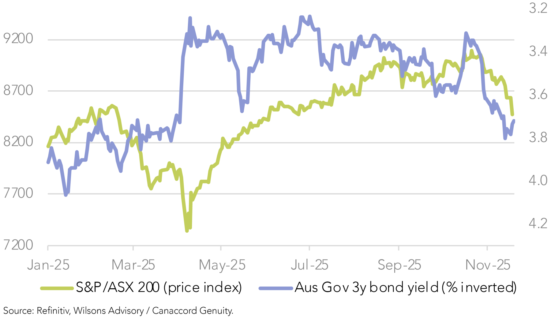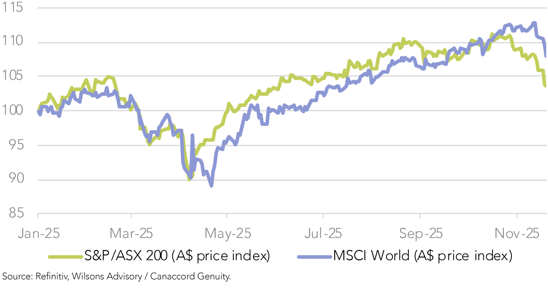 US Equities have appeared nervous in recent weeks around the sustainability of the AI capex boom despite ongoing strong profit delivery, in addition to concerns that the Fed easing cycle may be less supportive than expected earlier in the year. A correction in US equities has been overdue. It is very difficult to say whether it has run its course in the short term. Medium term we continue to see the primary global trend as positive given strong profits, better economic growth in CY26 and a Fed that is still more likely to cut than raise rates over the coming year.
