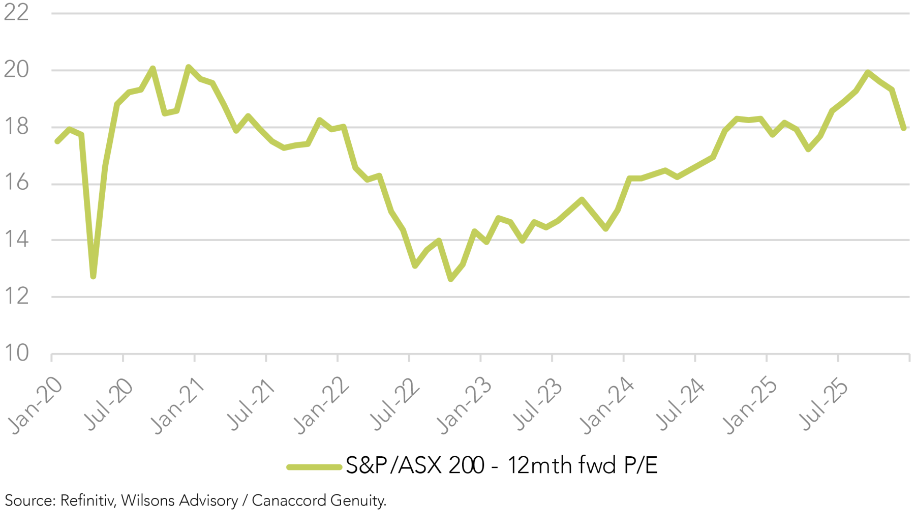 Outside of what was a stretched peak valuation (19.5x forward earnings in mid-October), the most obvious driver of the recent domestic pullback is the shift in market expectations for RBA rate cuts. Surprisingly strong inflation for the September quarter (released October 29), followed by a rebound in the labour market data for October, has seen expectations for rate cuts over the coming 12 months reduced from two more cuts to an “on hold” view.