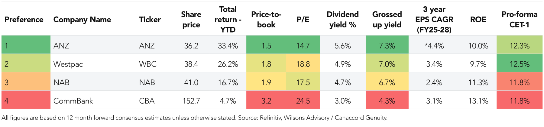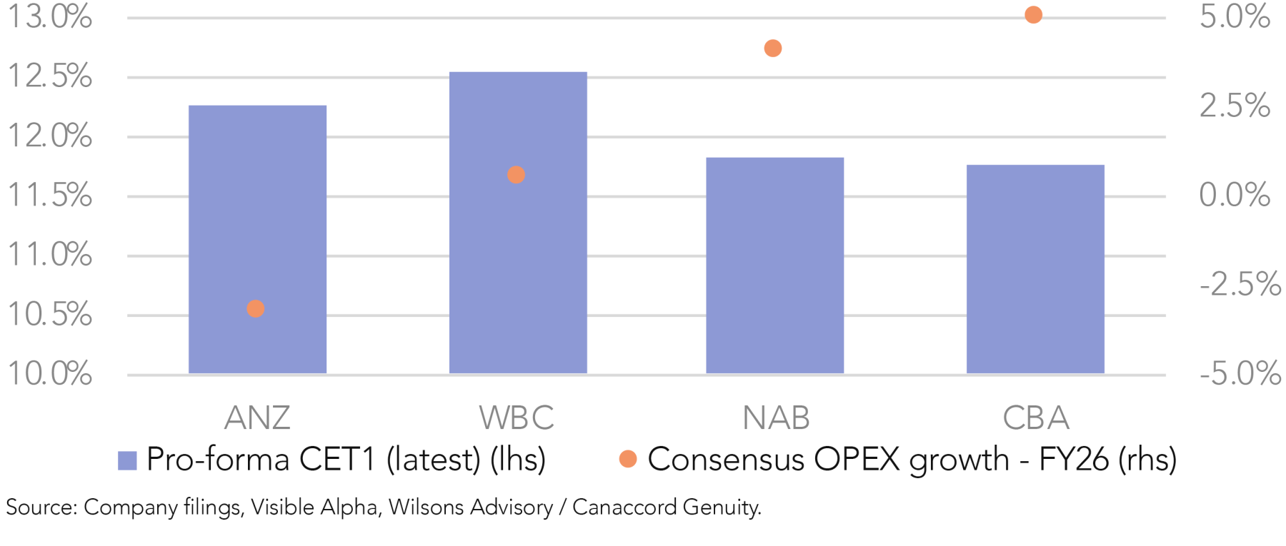 Broadly speaking, the upside case for the sector at current valuations rests on the delivery of EPS upgrades. These could be driven by stronger-than-expected credit growth and/or continued benign asset quality backdrop, which may enable further provision releases. In addition, our preferred exposures, ANZ and WBC (explored below), offer incremental upside from internal ‘self-help’ initiatives (tech and productivity), as well as the potential for capital management – particularly in the case of WBC.