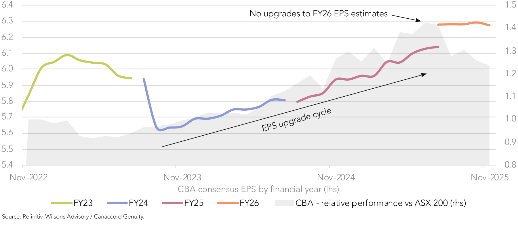 Overall, with CBA’s upgrade cycle stalling, peers gaining consensus earnings momentum, and its valuation premium still substantial, we see further downside in CBA’s relative performance as the market continues to rotate.
