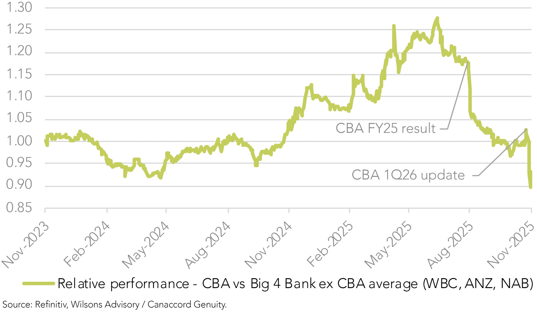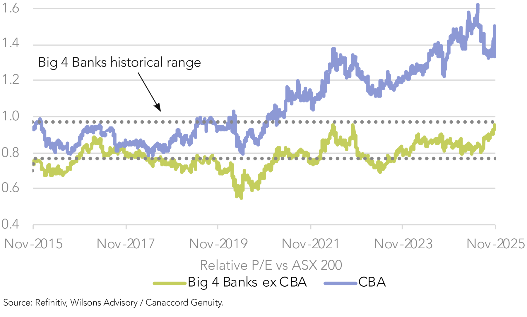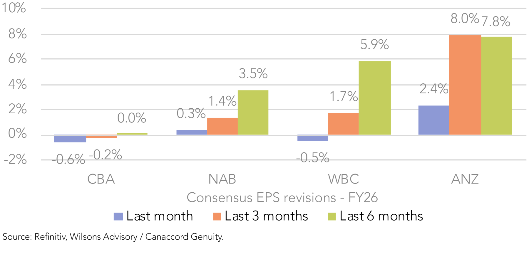 However, CBA has begun to unwind some of that outperformance as upgrades have waned. The bank’s ‘in-line’ FY25 result and 1Q26 updates both failed to meet elevated expectations for further earnings upgrades, while also raising concerns around rising costs and a declining CET1. This is at a time when other banks – particularly ANZ and Westpac – have shown improving consensus earnings momentum, which is shown on Figure 7.