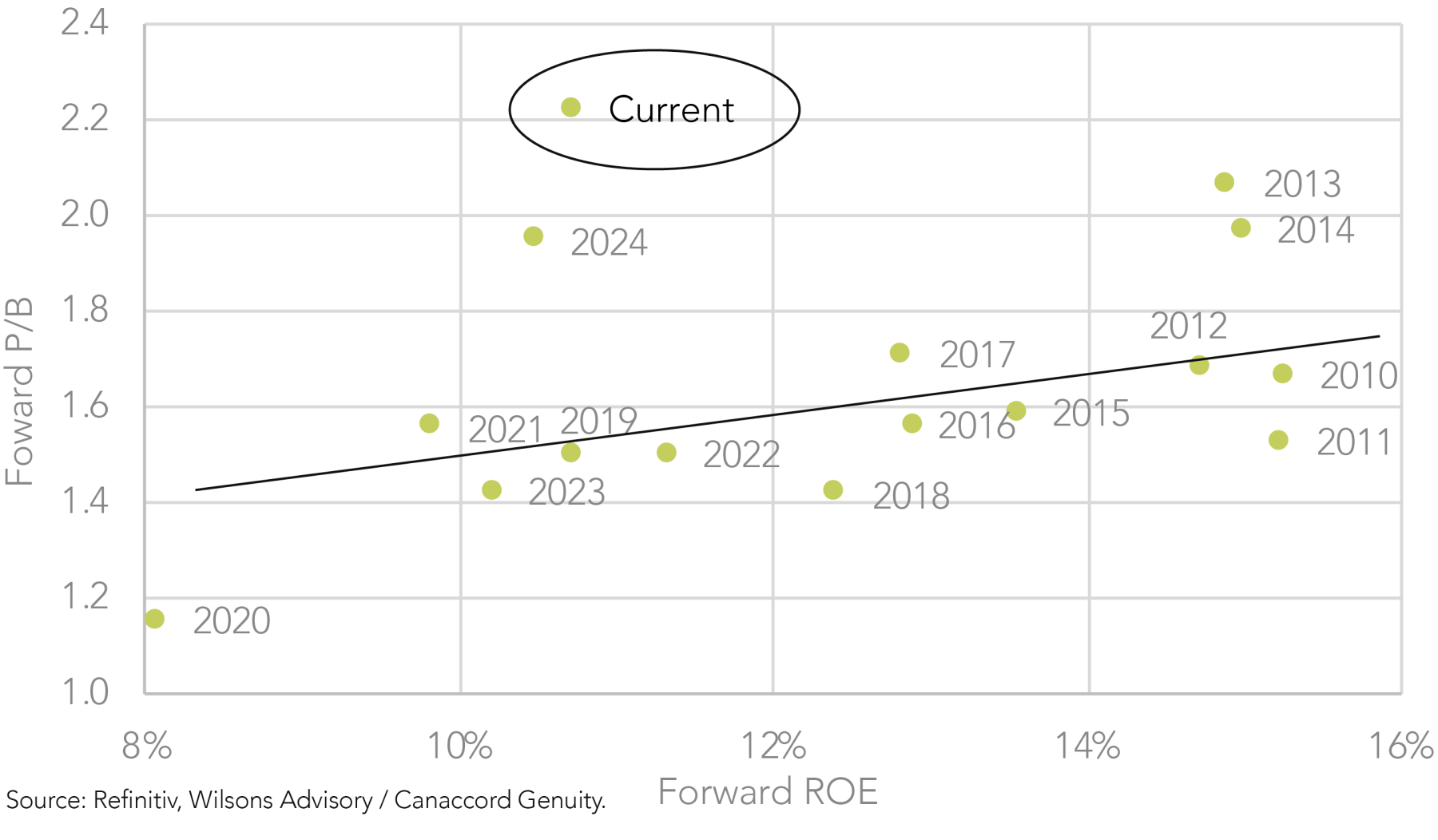 After material outperformance since the Fed’s late-2023 pivot, the ASX 200 Banks sector is expensive from both a forward P/E and price-to-book (P/B) perspective, at multiples of 20.7x and 2.2x, which are 43% and 46% above their respective 10 year averages. The sector’s P/B ratio is particularly demanding relative to history in the context of a low-double digit ROE, which is shown in Figure 10.