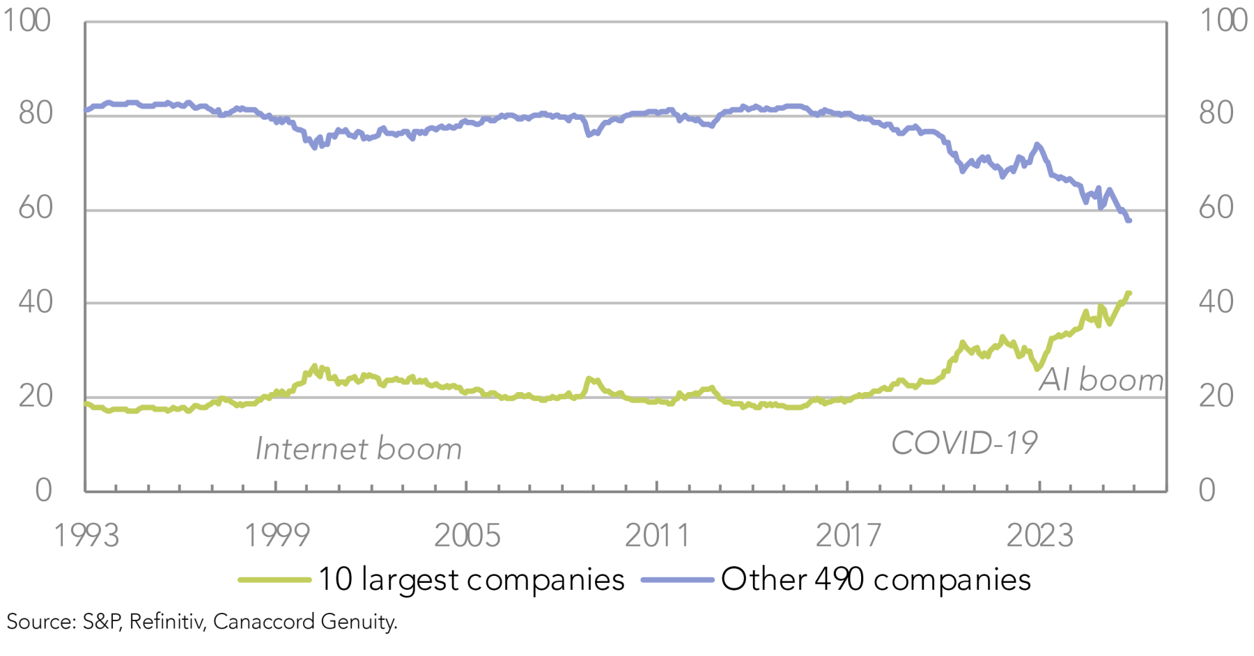 With the US market’s largest stocks mostly tech companies, the concentration of the S&P 500 evident in Figure 1 is also reflected in the large, combined weighting in the index of the IT and Communications sectors, which now comprise around half of the index’s capitalisation, similar to the internet boom a quarter of a century ago (Figure 2). Incidentally, this similarity may be a more meaningful way of considering if the current situation is comparable to the earlier boom, as there are differences between the two periods that may make other comparisons less categoric.