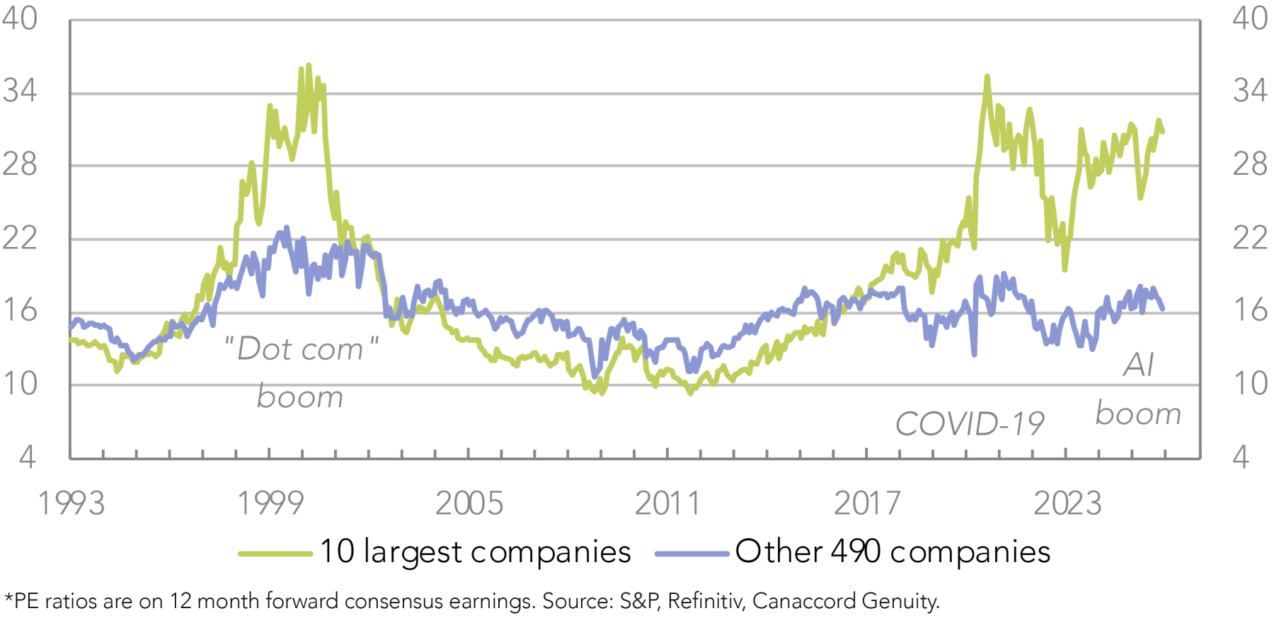 For example, compared to the Mag 7 that make up much of these tech sectors today, a group of less dominant companies comprised them in the internet boom. Hence, the earnings of the tech sectors in the two periods may not be equivalent and, in turn, the price to earnings (PE) ratios less comparable. Rather, it may be more meaningful to contrast the market capitalisation of the tech sectors across the two periods and the weighting within the index, as in Figure 2, as an indication of the sustainability of the scale in a market and economy that must have other sectors making up a reasonable share.