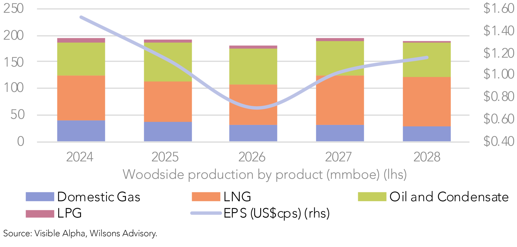 In contrast, despite a heavy CAPEX profile, Woodside is not expected to deliver any production growth over the medium-term. Near-term production growth from Scarborough-Pluto Train 2 (WA, LNG) – with first gas expected in 2026 – will only be enough to offset declining output from maturing assets. Woodside’s largest growth project, Louisiana LNG (USA, LNG), is relatively early stage, and is not expected to come online until 2029. It will also require significant CAPEX over the coming years.