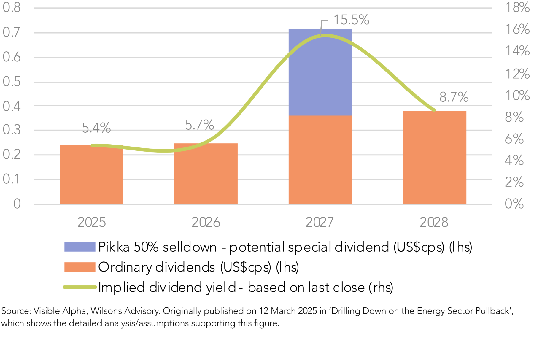Santos has the potential to unlock value and fund capital returns through targeted asset selldowns. We believe a selldown of Pikka post commissioning (due 1Q26) is high potential, particularly given the Trump Administration’s supportive policy backdrop for Alaskan oil. Assuming Santos sells down half of its stake in Pikka, we estimate this could liberate ~US$1.15bn of cash, which we expect would be used to fund capital returns to shareholders (see Figure 8).