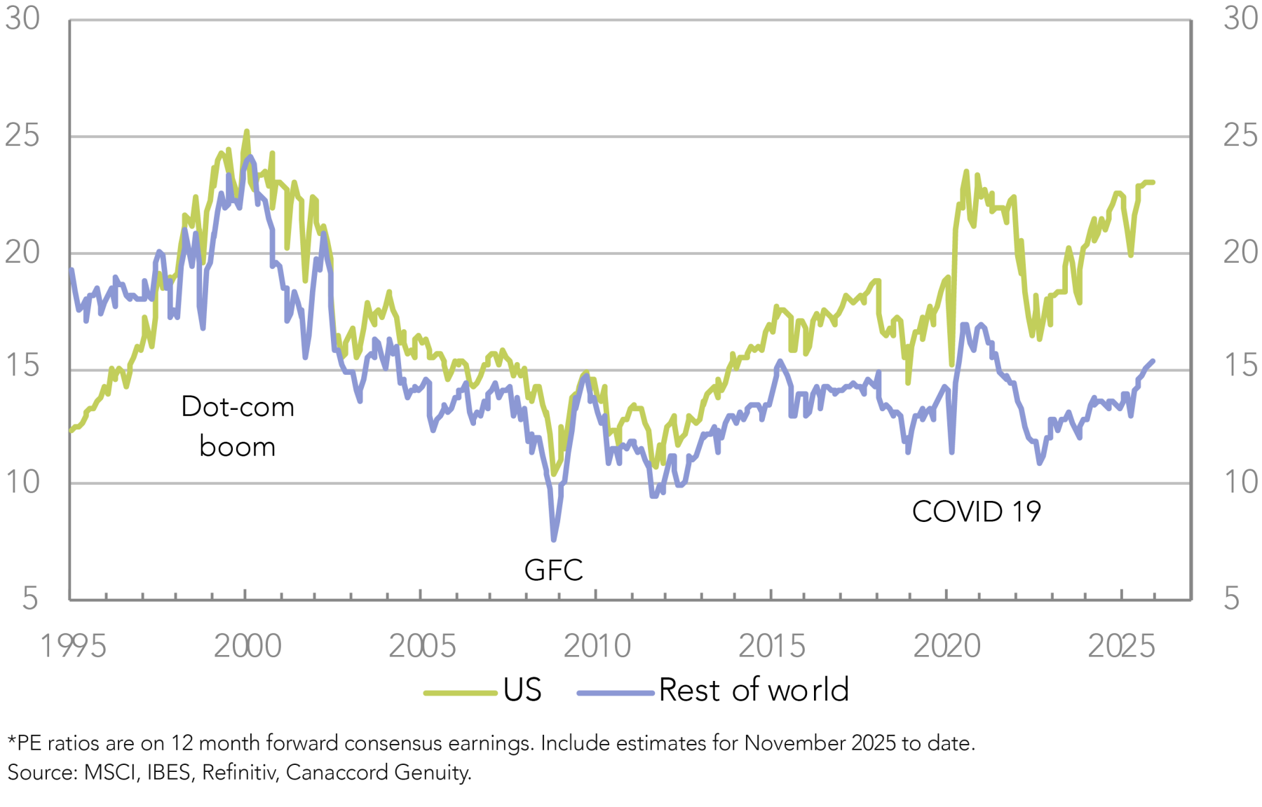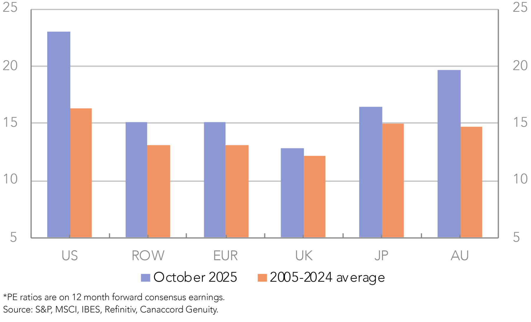 The economic resilience of the rest of the world in the face of the high US tariffs this year, in contrast to the slowdown in the US from the exceptional growth of prior years; and the still moderate valuations of other markets and the gap to the US, would seem to provide potential for further outperformance from the rest of the world in the period ahead, and grounds for diversification across global markets.
