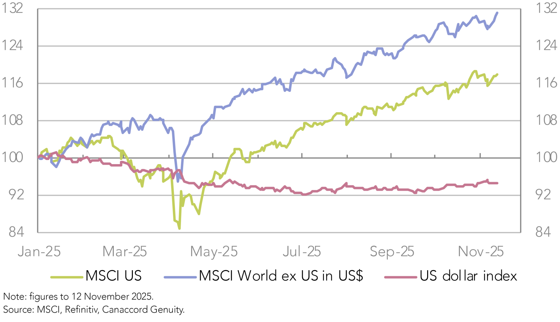 After more than a decade of US market outperformance, which has contributed to the idea of US exceptionalism, the tables have turned this year, with the rest of the world generating better performance than the US (Figure 2). A well appreciated contributor to this has been the depreciation of the US dollar, which has made it easier to account for why the US market has lost ground despite the continued strong earnings growth and the impressive adaptability and innovativeness of US companies.