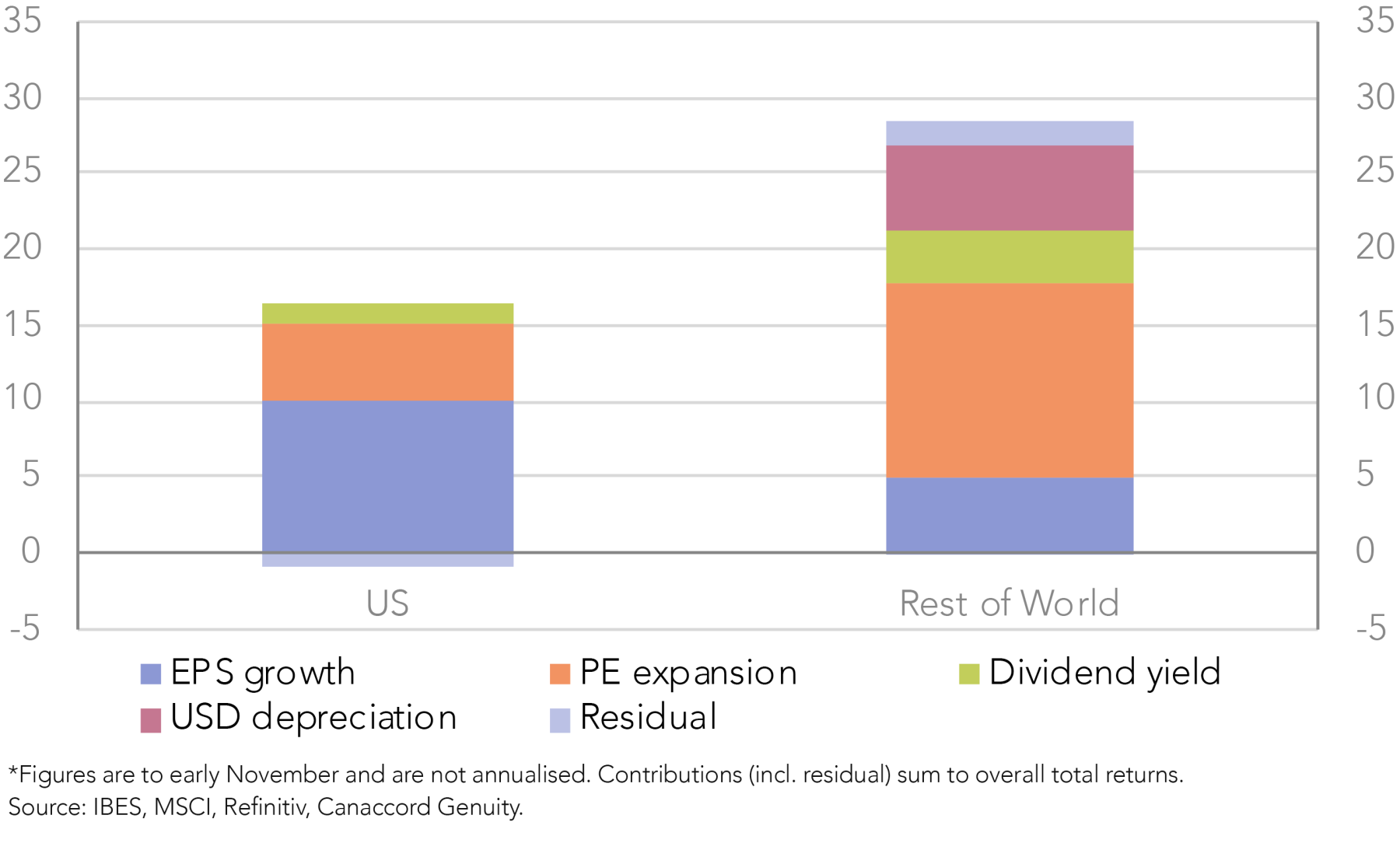 But the US dollar weakness is only part of the story and not even the main part. What has contributed more to the outperformance of the rest of the world, despite more moderate earnings growth, has been a significant rise in market valuations, or PE expansion as some call it (Figure 3). This has added substantially to the rise of other markets this year and more than made up for the lower earnings growth than in the US.