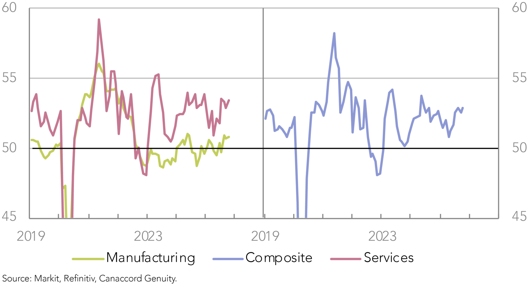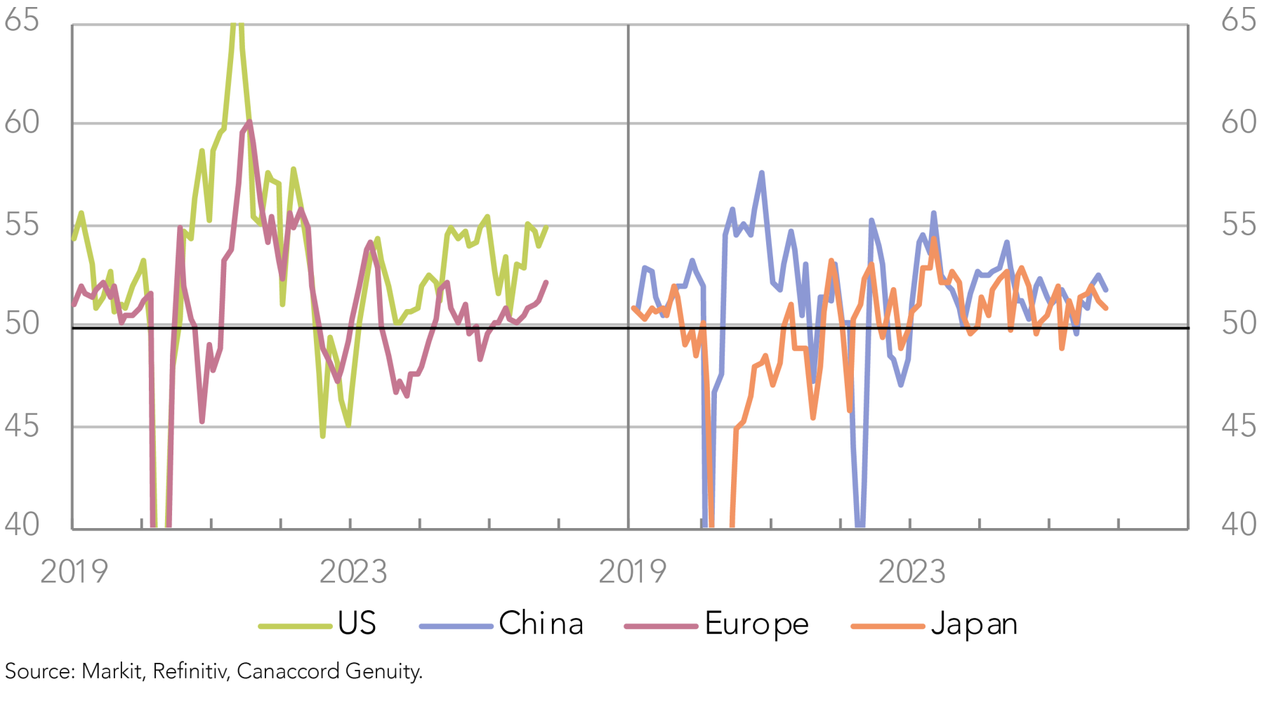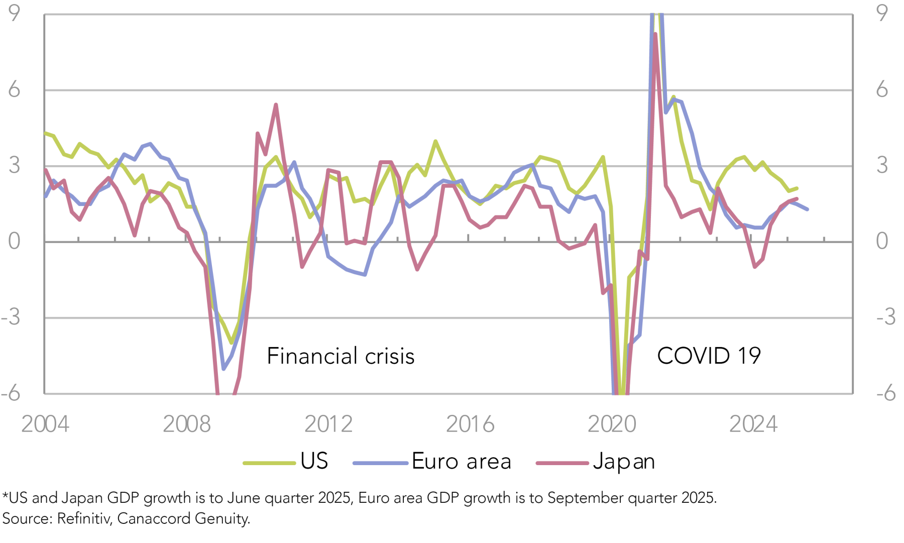 The US economy has also lost ground relative to others this year, facing headwinds from the US administration’s policies, while Europe and Japan have picked up since the bout of global inflation that followed the pandemic. The world experienced a scare earlier this year with the “Liberation Day” tariffs, but sentiment and activity look to have bounced back, with the widely monitored purchasing managers’ indices (PMIs), which track business conditions, suggesting global economic activity remains resilient going into year-end (Figure 5). Moreover, across the major economies, activity looks reasonable and to be potentially strengthening (Figure 6).