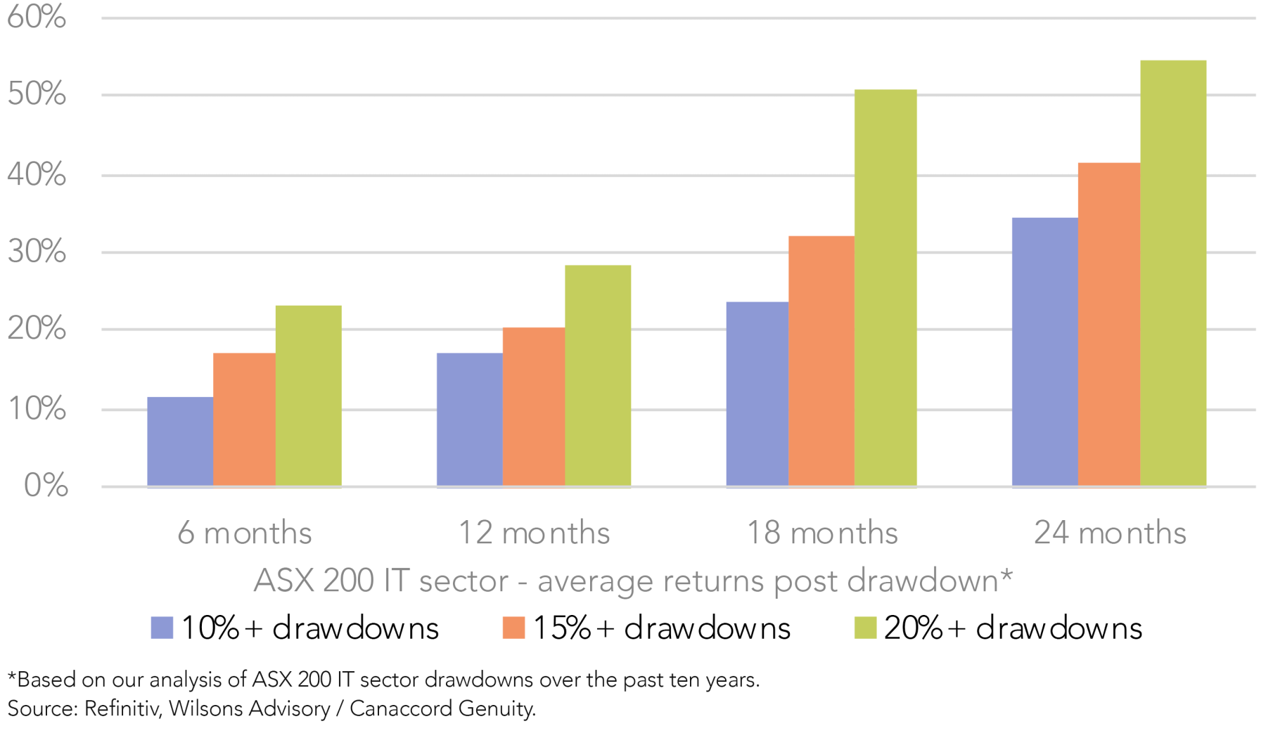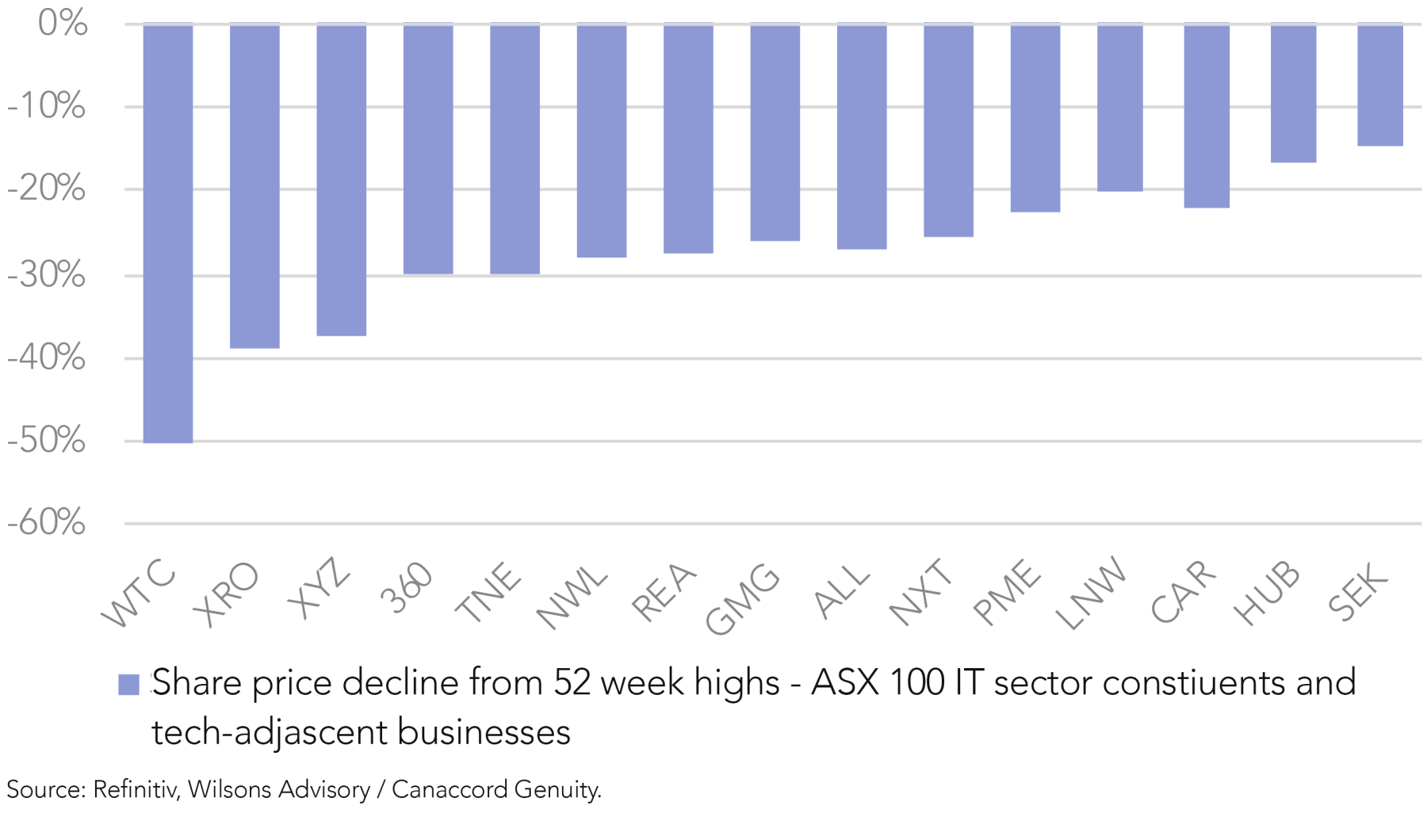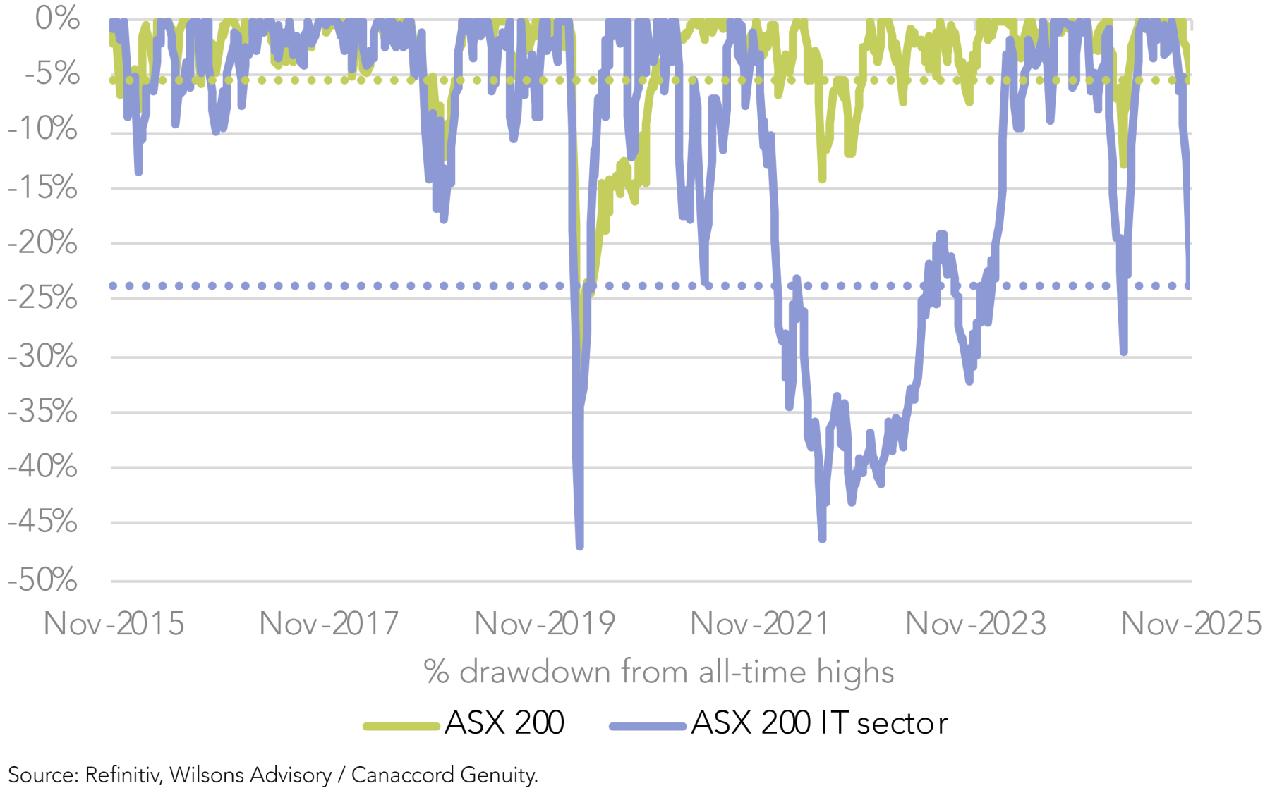 The ~6% drawdown in the ASX 200 has been accompanied by a far sharper pullback in the domestic IT sector, which is now down ~25% from its recent highs.