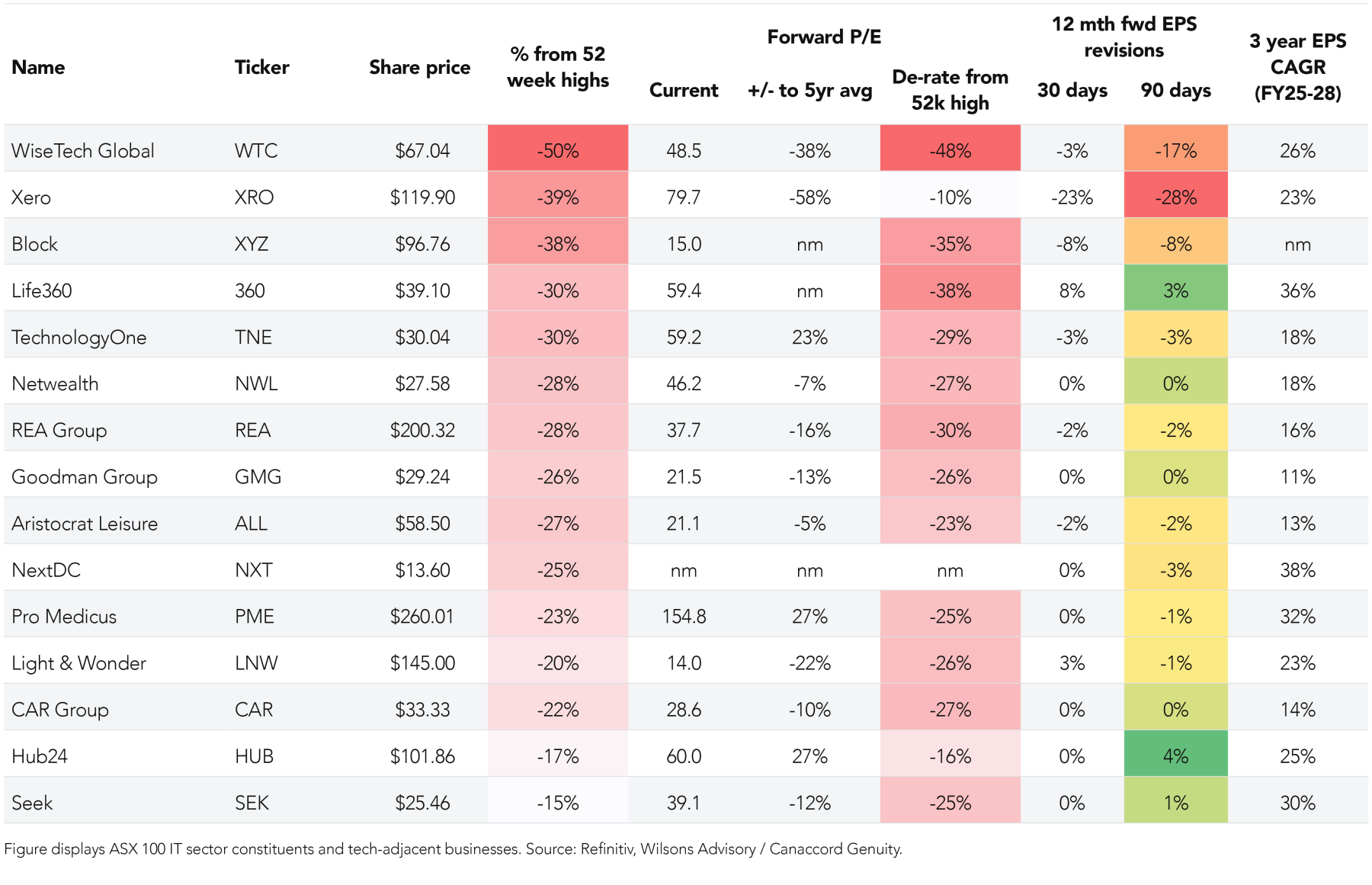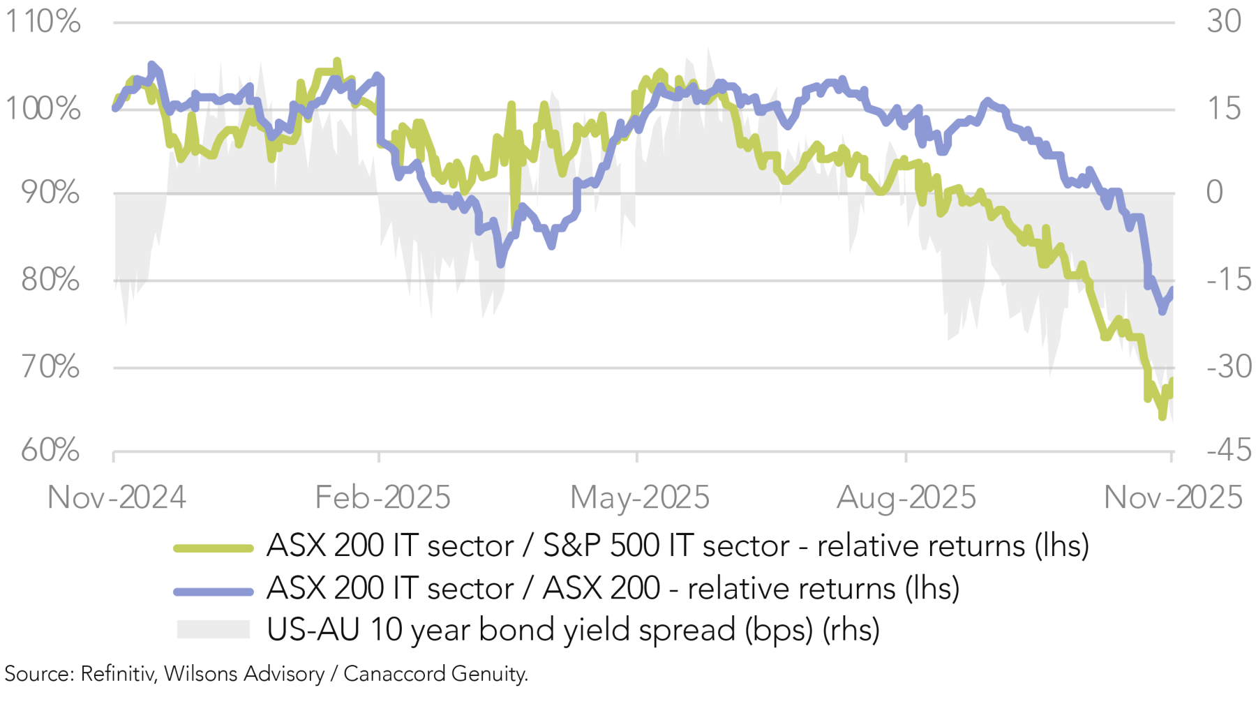 This has been particularly true when underlying company fundamentals remain solid and macro conditions – particularly long-term bond yields – are relatively stable. Both conditions largely hold today: the ASX 200 IT sector still offers a three-year forward EPS CAGR of 24% (well above the 8% offered by the broader ASX 200), while a consensus ‘on-hold’ RBA view – alongside our expectation of range-bound to lower bond yields – suggests tech valuations are unlikely to face additional material macro headwinds.