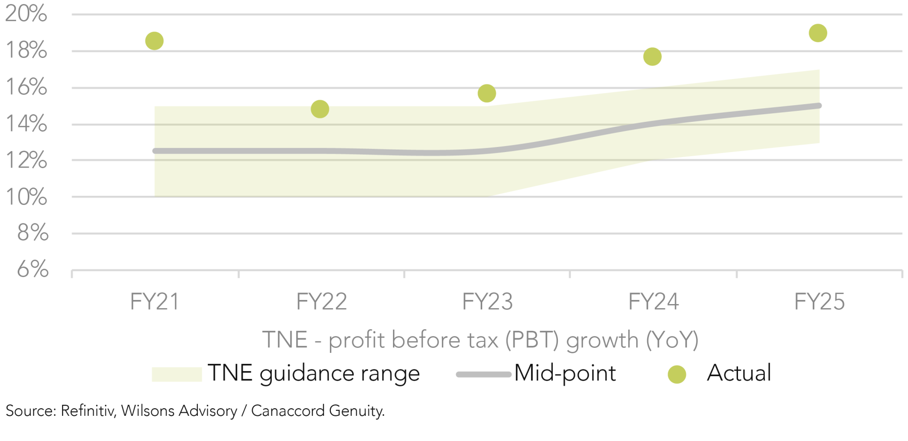 TNE delivered a broadly positive FY25 result: profit before tax (PBT) rose +19% YoY to $181.5m, well ahead of 13–17% guidance. However, headline EPS growth of +16% YoY was 2% below expectations due to a slightly higher tax rate, which we view as a ‘low-quality’ miss.