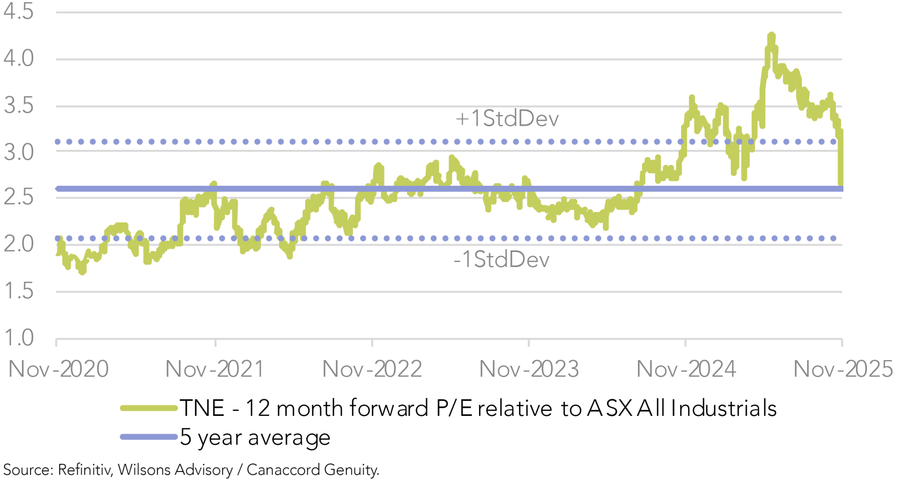 The decline in TNE’s share price following its result largely reflects the correction of its supernormal valuation – with forward P/E having recently peaked at ~90x – leaving effectively no margin for even a very modest miss at reporting.