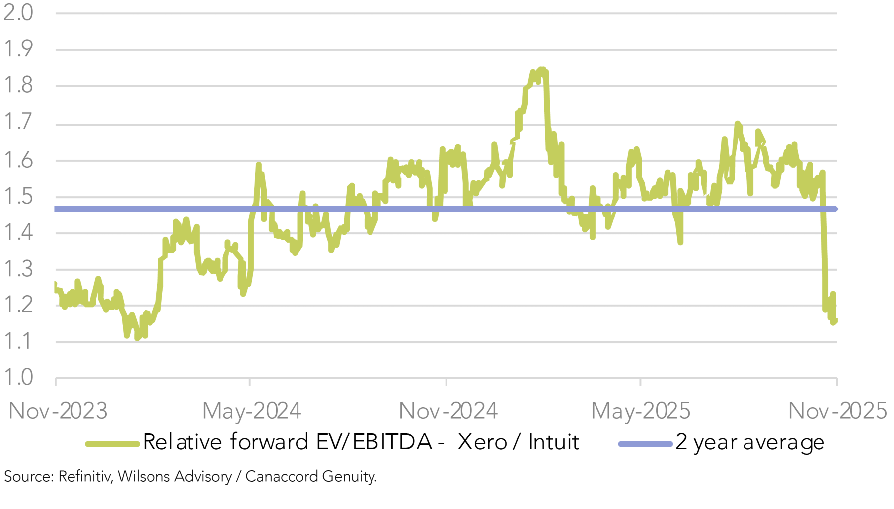 XRO’s forward EV/EBITDA has de-rated sharply, from ~38x in July to ~24x today – its lowest on record.