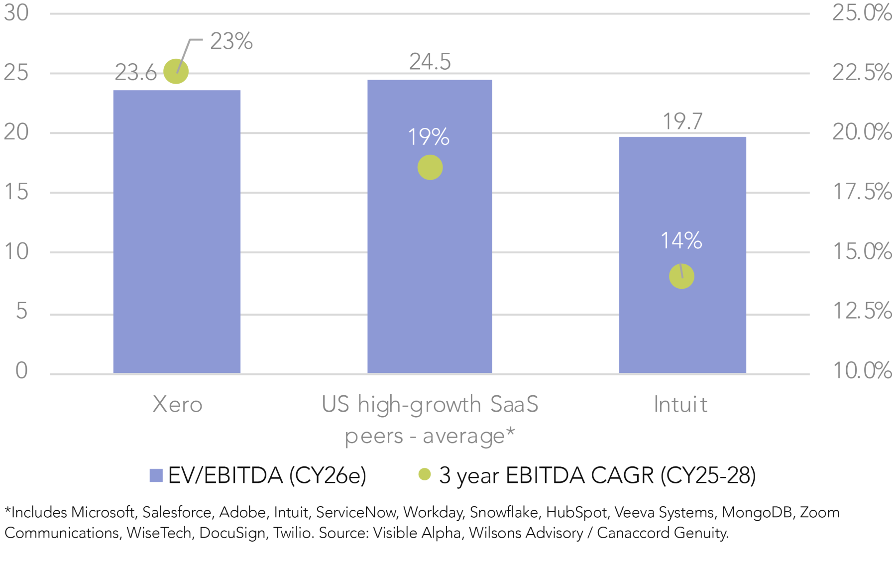 While XRO still trades at a ~20% premium to Intuit, this is materially below its two-year average of ~47% (since XRO’s profitability pivot). Given XRO’s three-year EBITDA CAGR of 23% versus Intuit’s 14%, the market is currently assigning too small a premium, in our view. Put another way, on a growth-adjusted basis, XRO appears undervalued relative to Intuit, with an EV/EBITDA-to-growth ratio of ~1.0x versus Intuit at ~1.4x.