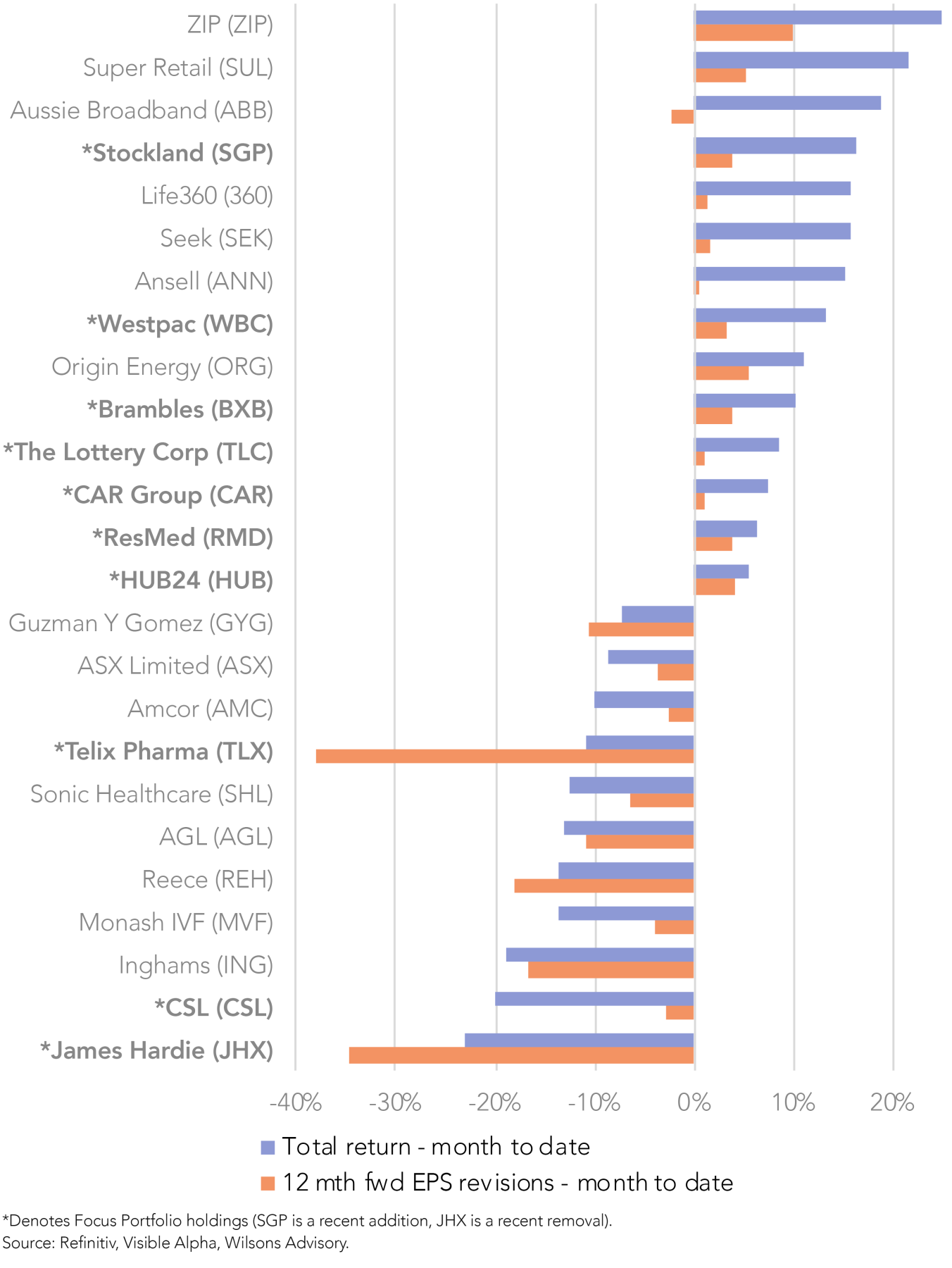 * SGP is a recent addition to the Focus Portfolio, JHX is a recent removal. Source: Refinitiv, Visible Alpha, Wilsons Advisory.