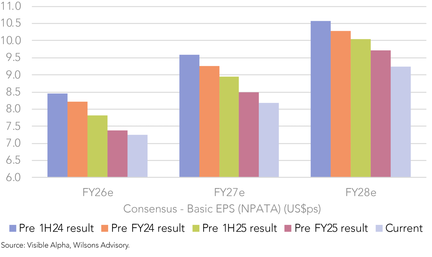 Disappointingly, CSL has once again not delivered against our expectations. CSL’s FY25 result was a very low quality NPATA beat (driven by lower R&D and tax expenses), while its guidance was weak. FY26 guidance is for NPATA growth of 7-10%, which at the mid-point is below consensus (+9%), despite excluding US$700-770m of restructuring costs and including some initial cost-out benefits. Since the result, FY26e consensus EPS (NPATA) has been downgraded by 4%.