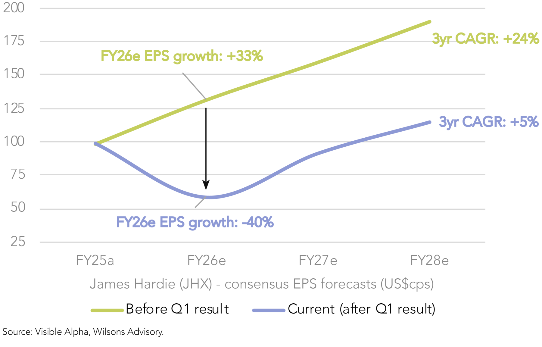 JHX’s 1Q26 update was significantly worse than expected. In Q1, EPS fell -59% to 15cps, well below prior consensus forecasts of 36cps, which were looking for flat EPS compared to Q1 FY25 rather than a significant decline.