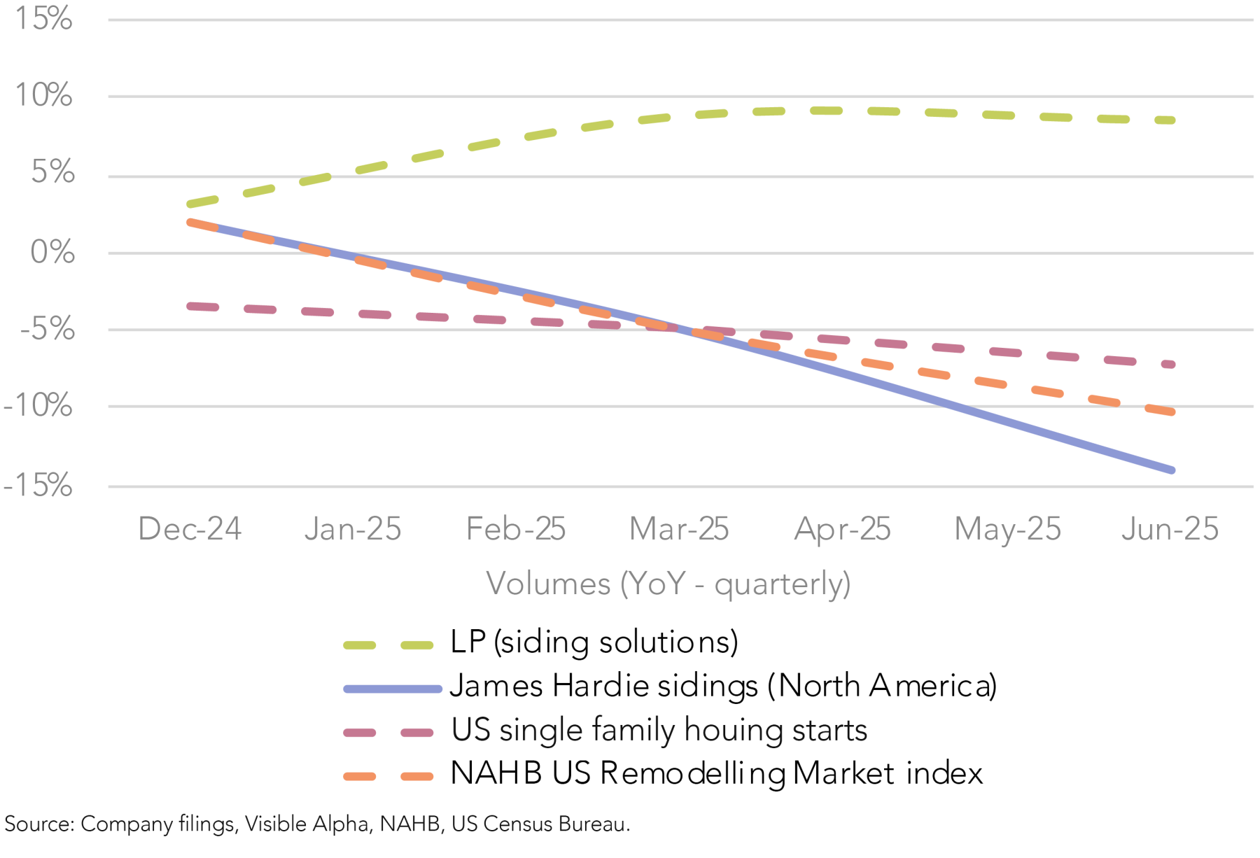 We also have concerns that JHX may be losing market share in the US. While management has indicated it is holding its market position against competitors and has pointed to channel destocking as a reason for the sharp decline in Q1, we note JHX has underperformed the North American sidings volumes growth achieved by key US peers, including Louisiana Pacific (LP) and TREX.