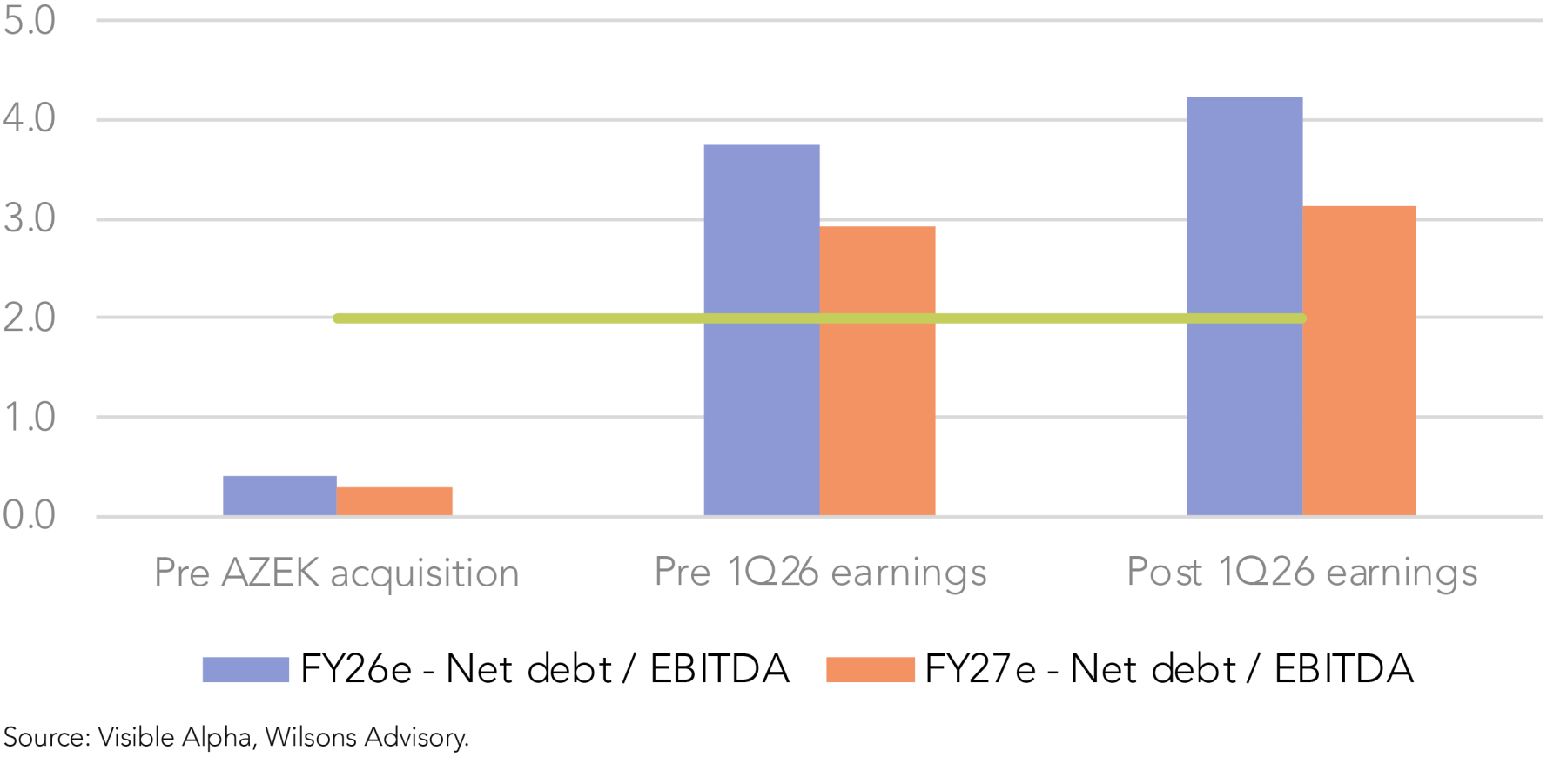 Management also updated its guidance, incorporating three quarters contribution from AZEK, pointing to EBITDA of $1.05-1.15bn in FY26, which is ~15-20% below prior consensus estimates (on a like-for-like basis). Previously, JHX guided towards flat-to-low single digit growth in North American volumes. However, the latest guide implies mid double digit declines for the legacy sidings business (ex AZEK) – a substantial lowering of expectations in just a three-month period.