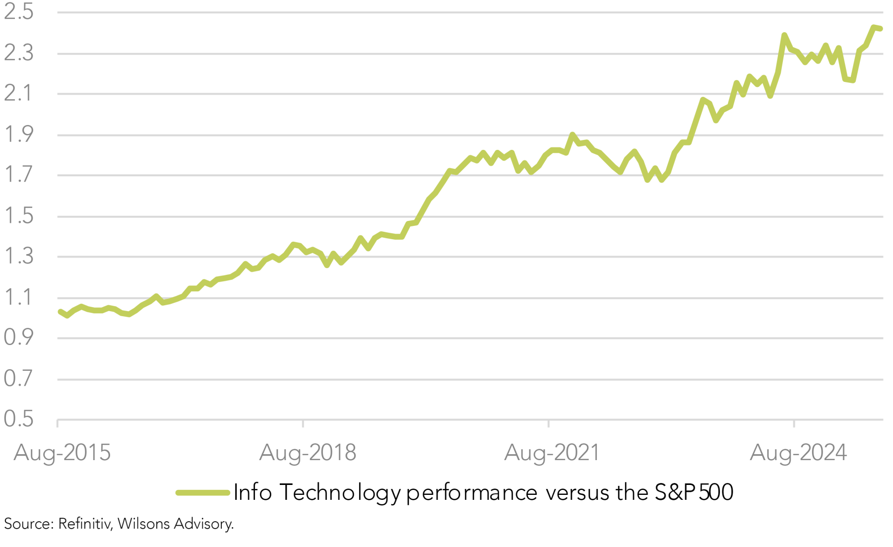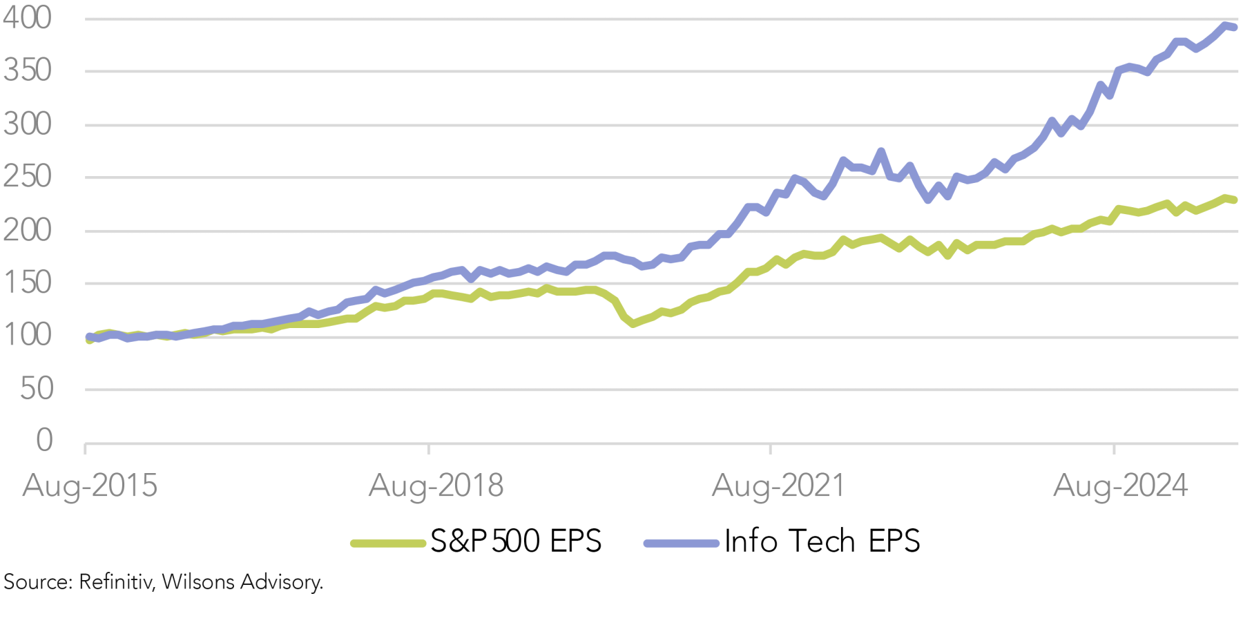 The recent US reporting season delivered another quarter of double digit earnings growth (~12%) despite concerns over the impacts from tariffs and evidence of a slowing US economy. Tech has led the way over the last 10 years and once again over the last 12 months. Market estimates continue to suggest Tech earnings leadership over the coming year and beyond.