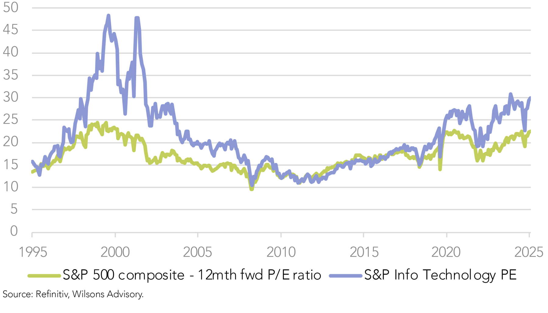 One difficulty in assessing the valuation of the US market versus its own history is the growth in the relative size of the Tech sector. The IT sector made up only 6% of market value in 1990 and as recently as 10 years ago was around 15%, while now on our “Tech plus” definition it is close to 50%.