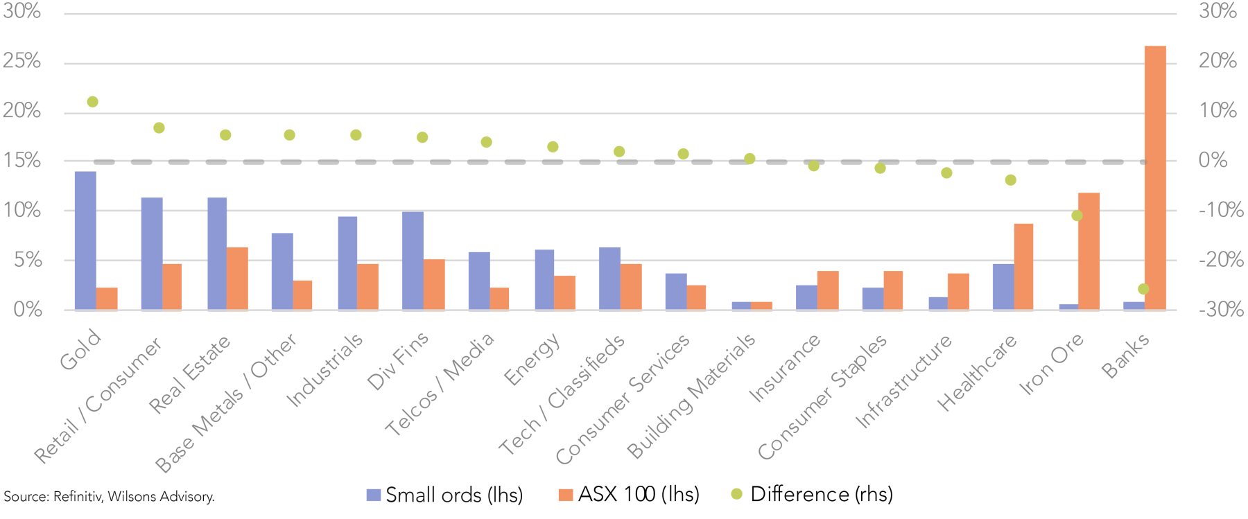 While just the banks and iron ore comprise ~38.5% of the ASX 100, these low growth sectors account for just ~1.5% of the Small Ords, as seen in Figure 1.