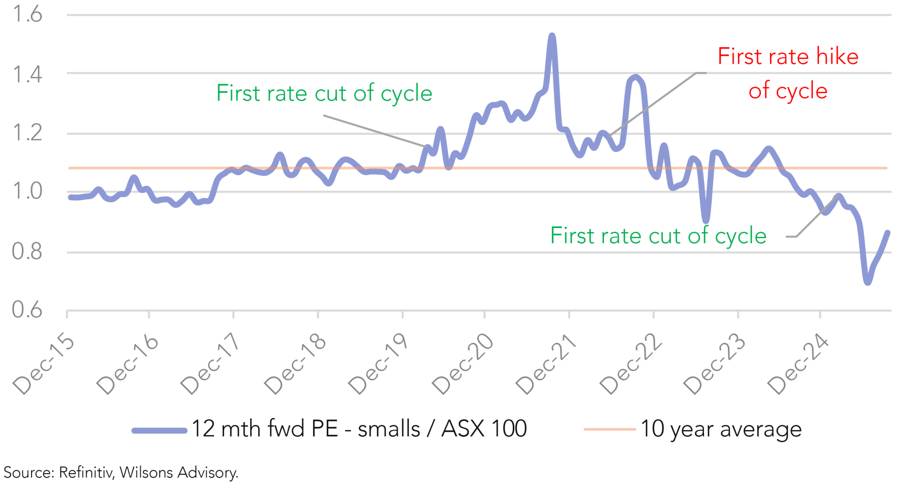 Since the RBA’s first rate cut in February, small caps (Small Ords) have outperformed large and mid caps (ASX 100), yet still trade at a significant discount. This suggests further opportunity for outperformance.