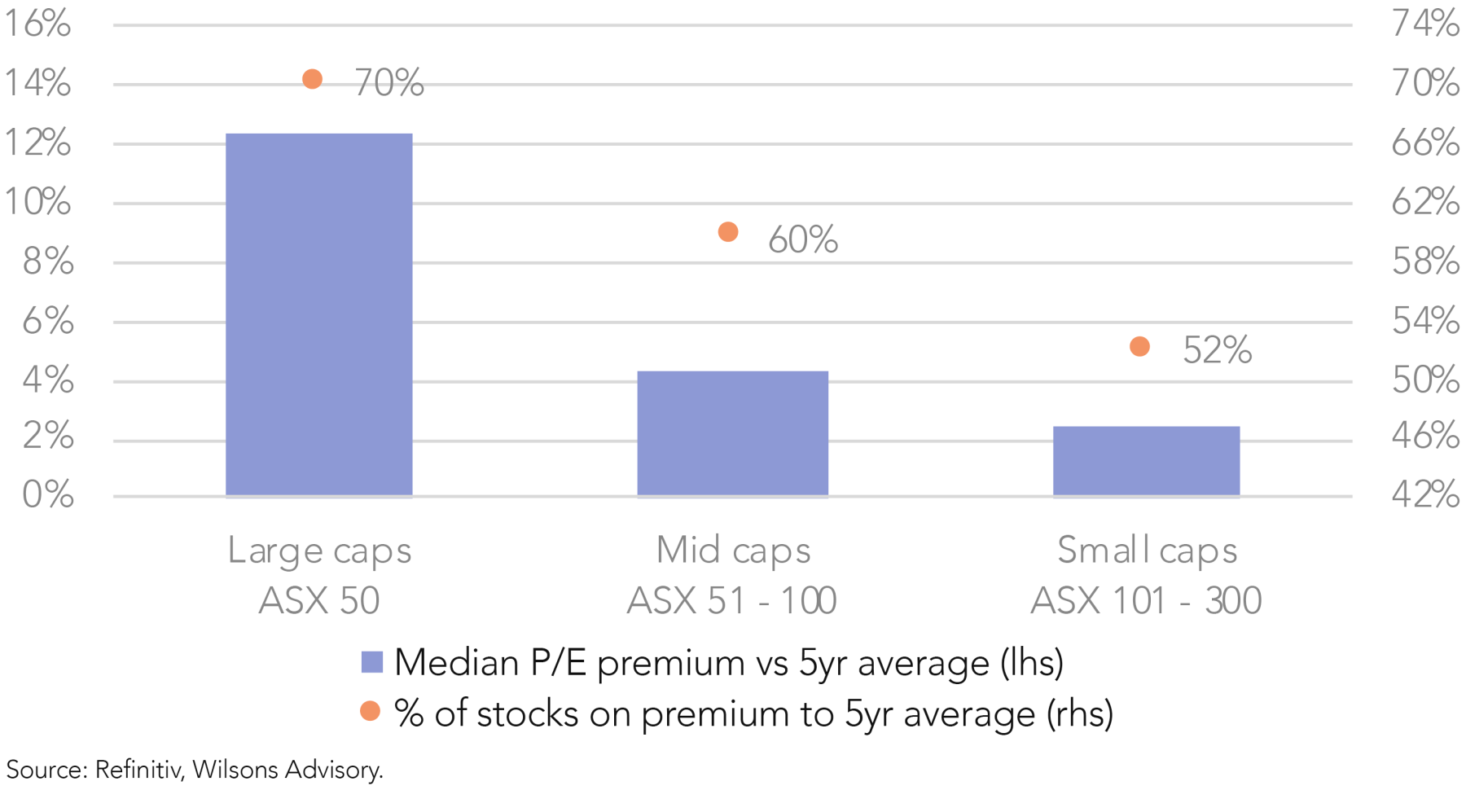 While small caps have outperformed since February as investors acknowledge the earnings boost provided by rate cuts, valuations have yet to overrun and still provide an attractive entry point. Figure 4 shows that while the Small Ords has bounced back from a 30% discount to the ASX 100 P/E to 13%, this is still well below its historical premium of 10%, demonstrating that small cap valuations are far from overextended and still has a viable pathway to continue to re-rate. When compared to its own historical average, large caps screen very expensively, trading at a 13% premium to its five year average P/E, with two-thirds of companies trading at a premium, as seen in Figure 5. This is compared to small caps, trading at just a 1% premium at the index level, while only half of the constituent companies are trading above its own historical average.