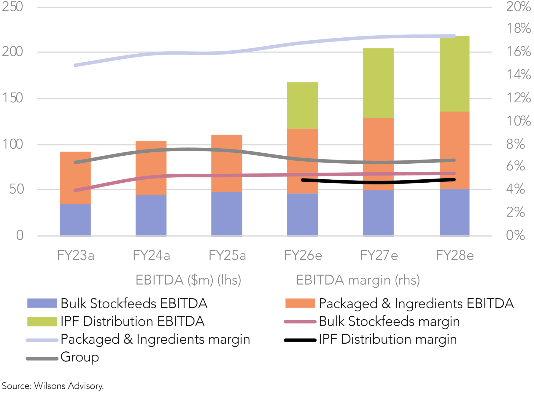Management’s investment in premiumisation continues to deliver a mix shift towards higher margin products. Investment is focused on product development, branding and marketing, packaging, service and customer experience to provide packaged feeds for companion animals, specialised higher-nutrition feeds for livestock and high quality ingredients. With Packaged Feeds and Ingredients delivering ~16% EBITDA margins versus ~5% in Bulk Stockfeeds, growing this segment is a key driver of group margins.
