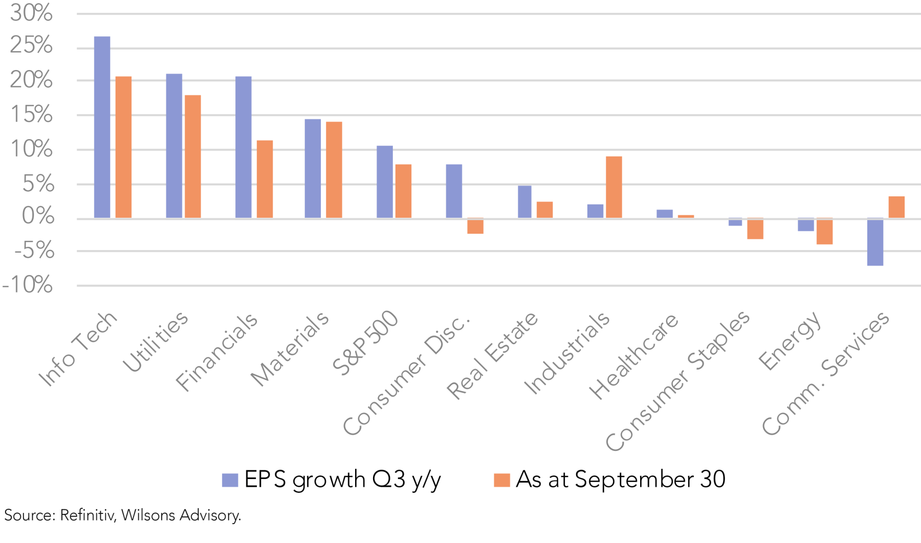 Once again, the US tech sector has continued to lead the way in terms of earnings growth and positive earnings surprise. The sector looks set to deliver 27% year-on-year earnings growth in Q3. This is up from the 21% estimate on September 30.