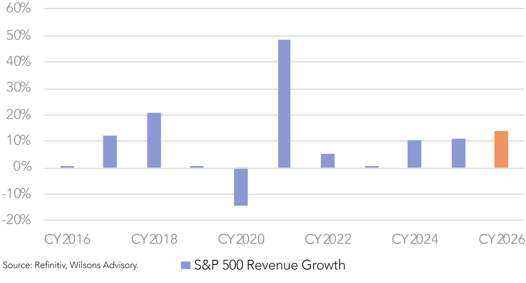 A strong profit backdrop remains a central supportive pillar of the US bull market, as it has for much of the last 10 years. The CY26 outlook appears robust at this stage. Like market price performance, the earnings cycle is undeniably being led by tech. However, sector earnings breadth is expected to broaden out in CY26 (see figure 7).