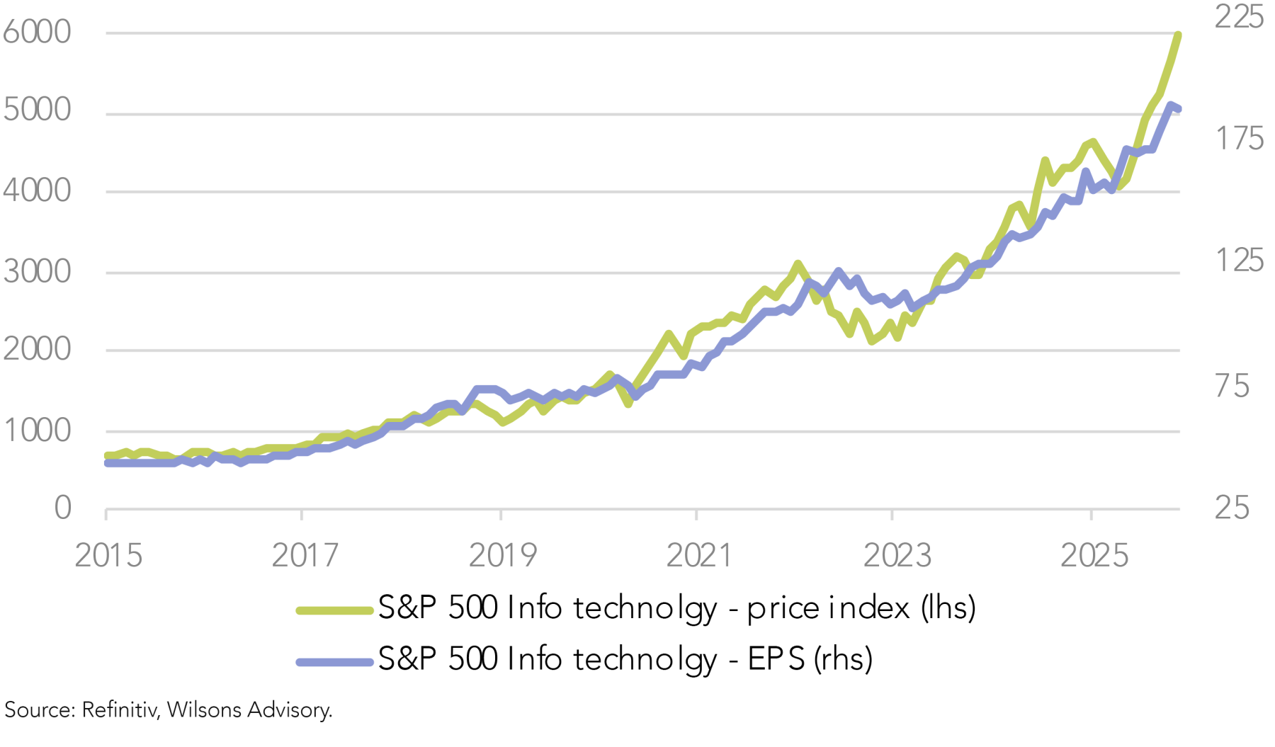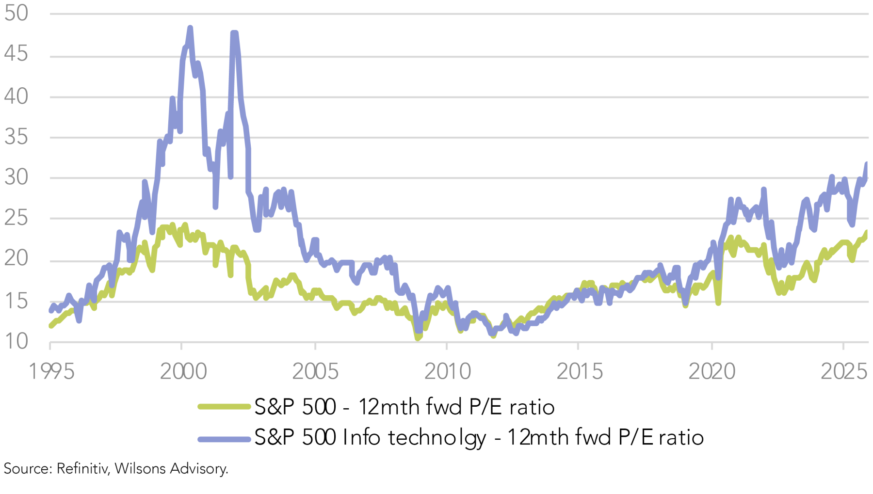 Expectations for technology sector earnings growth in CY26 stand at 22%. As is the case for the market overall, we feel the US tech sector’s valuation (32x 1-yr forward EPS) needs to be assessed against its earnings growth delivery and earnings growth prospects. From this perspective, the sector does not look expensive.