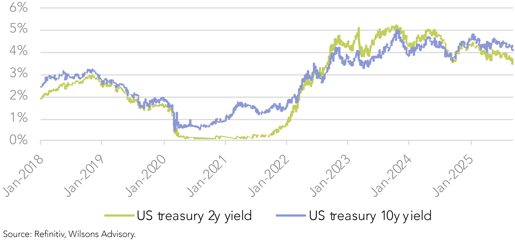Just when this narrative was beginning to capture significant investor attention, signs of a weakening US economy (in labour market data in particular) has strengthened expectations for multiple Fed rate cuts in coming months. This has dragged yields lower across the curve. Benchmark US 2-year and 10-year yields have fallen significantly since early August, as two successive weak labour market prints have raised expectations for Fed rate cuts.