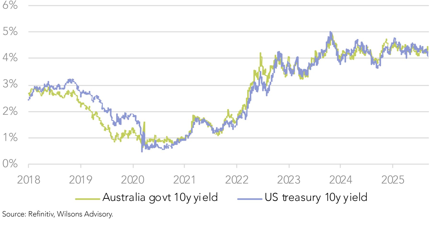 Domestic 10-year yields do still appear to have plenty of “term premium” relative to a terminal cash rate next year of 3.1% (based on the consensus view of two more cuts). As a result, our bias is to expect moderately lower 10-year yields on a three-to-six-month view. This would deliver some moderate capital gains to investors over and above the current solid running yield.