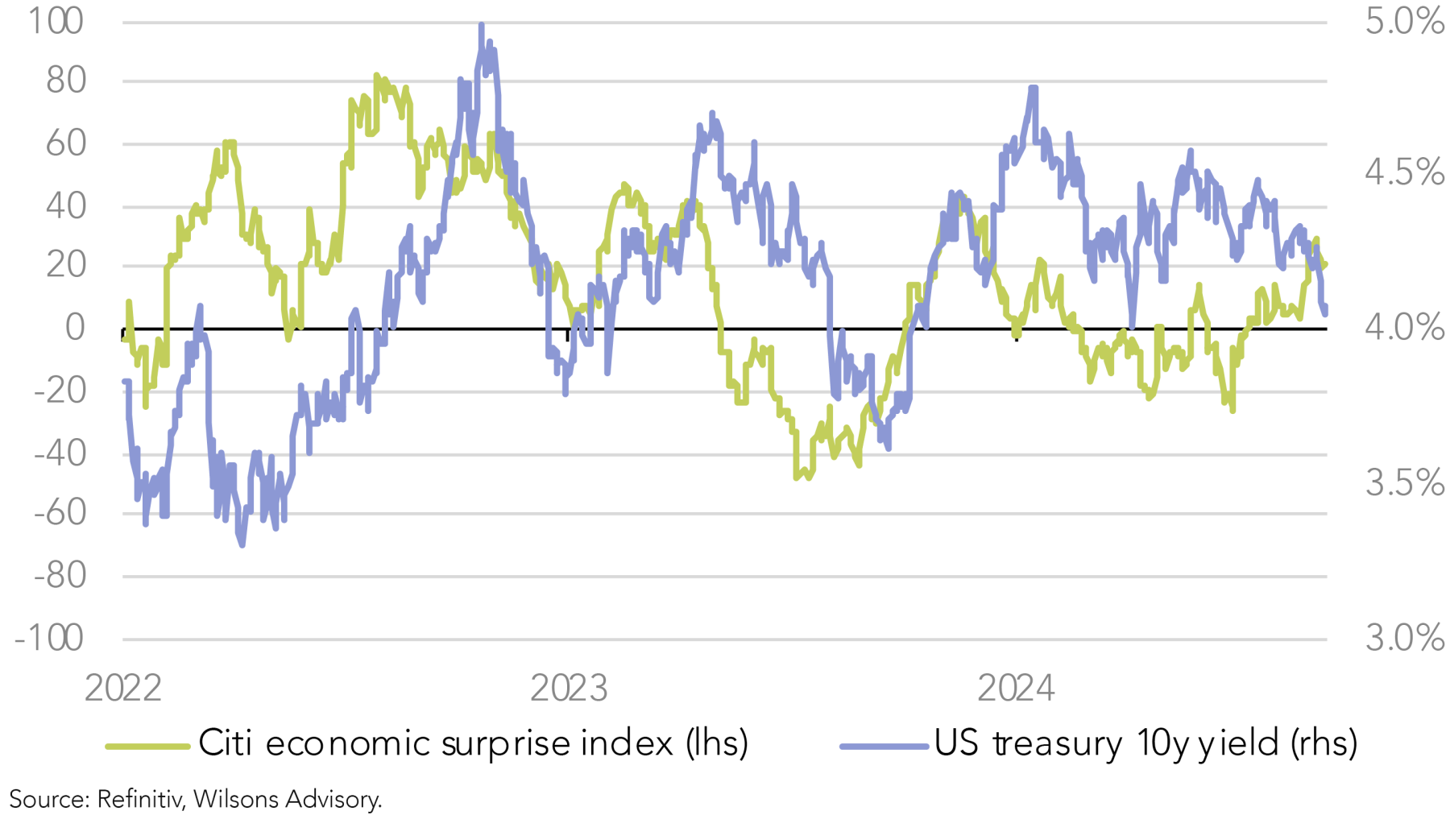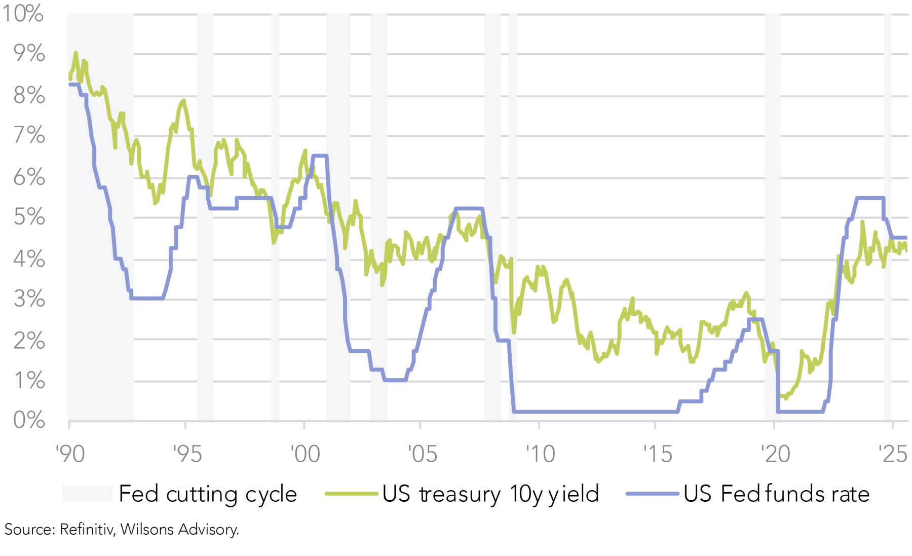 From this perspective, we believe the economic slowdown and monetary policy (easing) cycle will continue to dominate near-term and likely continue to drag bond yields lower into year end. We note the relatively strong historical linkage between the US economic surprise index and the short-term direction of 10-year yields. Perceptions of economic momentum continue to be very important for movements in bond yields, despite the persistence of large fiscal deficits. We also note the tendency of bond yields to fall as the central bank is cutting. Alongside the mathematical impact of cash rate expectations influencing yields further along the curve, a multi-cut easing cycle once again highlights the impact of a sustained soft period for the economy dragging bond yields lower.